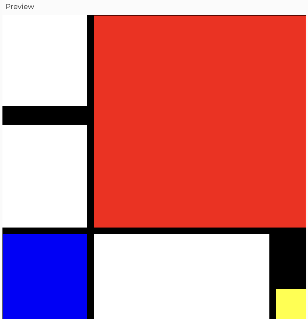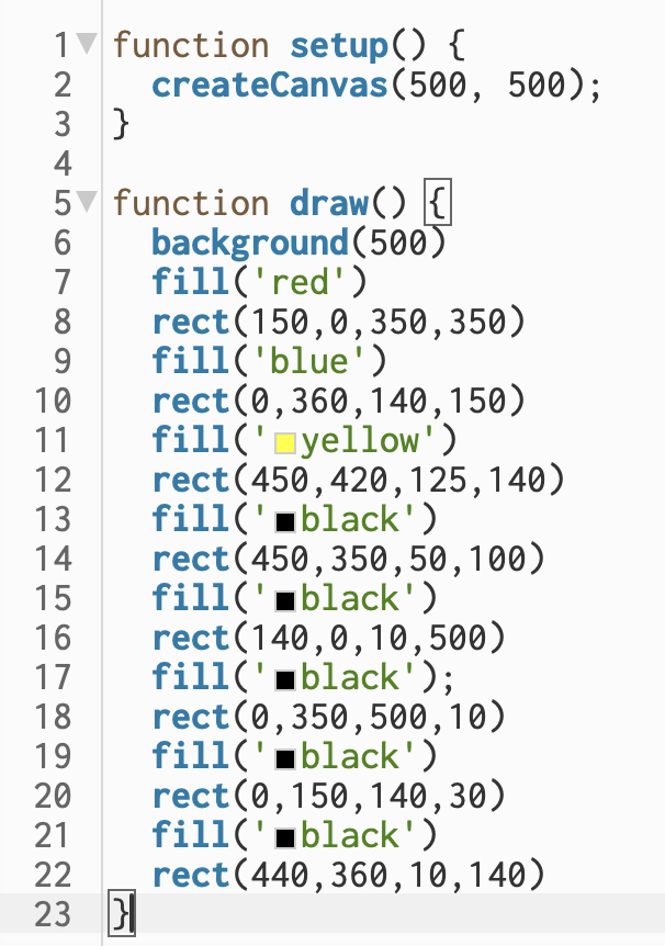Creo un canvas, creo cinque quadrati, cambio i colori dei quadrati in rosso, blu, giallo e nero. Infine per creare le 4 linee di spessore, ho utilizzato il comando rect con le coordinate adatte per completare il disegno.