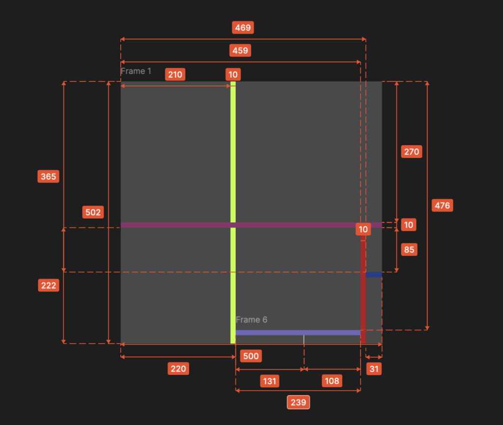 Per aiutarmi nell’identificazione delle relazioni spaziali sfrutto il file Figma creato precedentemente; ridisegno le componenti rettangolari e procedo misurandole con lo strumento apposito.