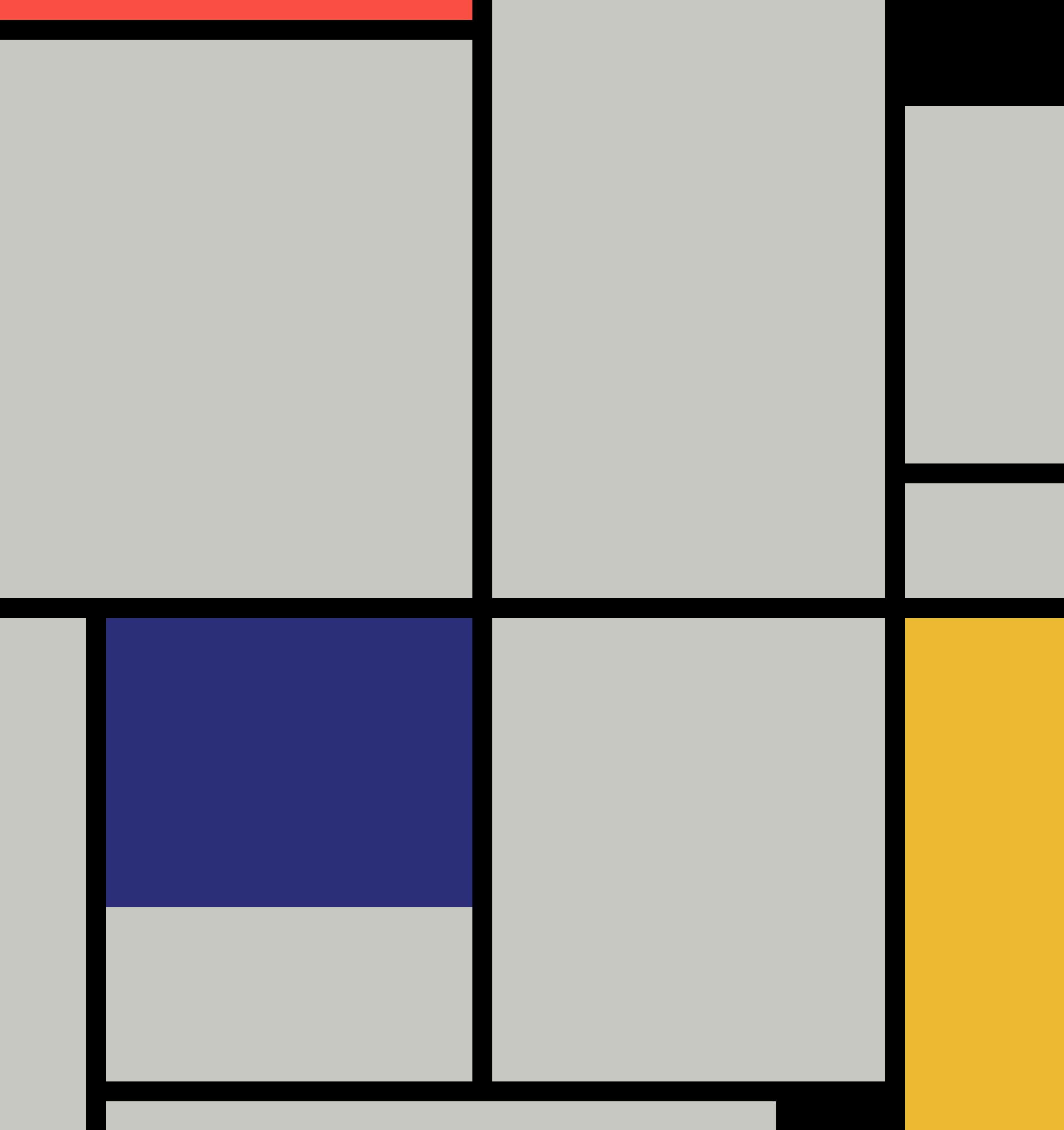 La struttura è basata su una griglia di rettangoli colorati e linee nere spesse che suddividono lo spazio in modo asimmetrico.