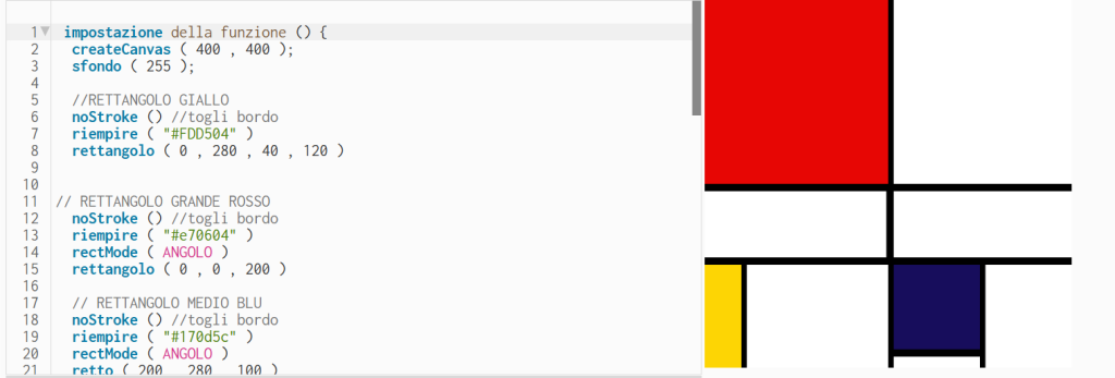 Dopo aver definito le dimensioni della tela e misurato coordinate e grandezze dei vari elementi, i dati sono stati utilizzati in p5.js. La composizione è stata ricostruita disegnando prima i rettangoli colorati e successivamente quelli neri, che formano la griglia caratteristica dell’opera.