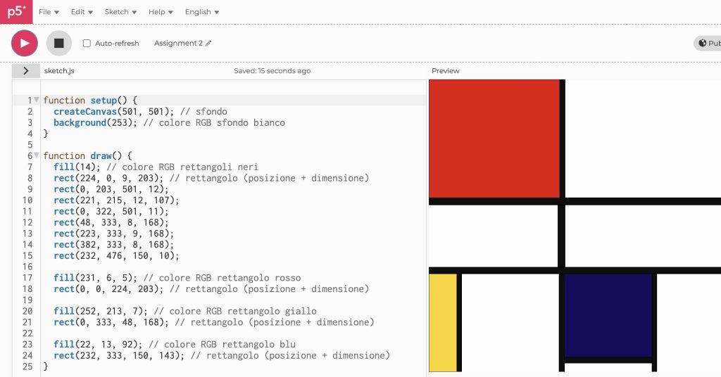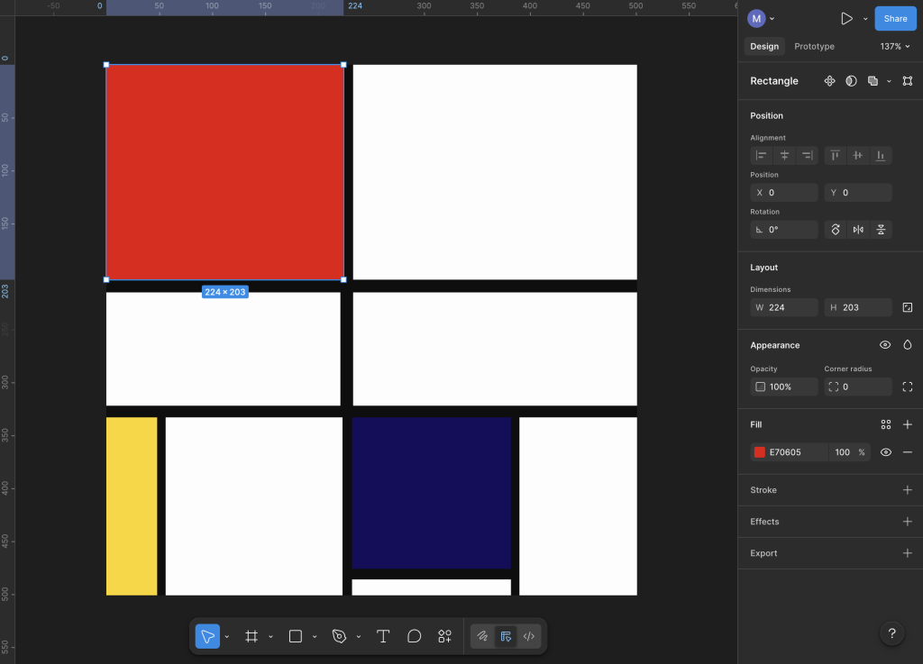 Per riprodurre Composition No. III, with Red, Blue, Yellow and Black di P. Mondrian (1929), utilizzando p5.js, ho iniziato realizzando l’opera su Figma. Tramite tale software ho potuto ricavare agevolmente le dimensioni e le posizioni di tutti gli elementi che compongono l’opera. Inoltre, tramite lo strumento contagocce, ho definito il colore di ciascun elemento, riferendomi all’immagine originale.