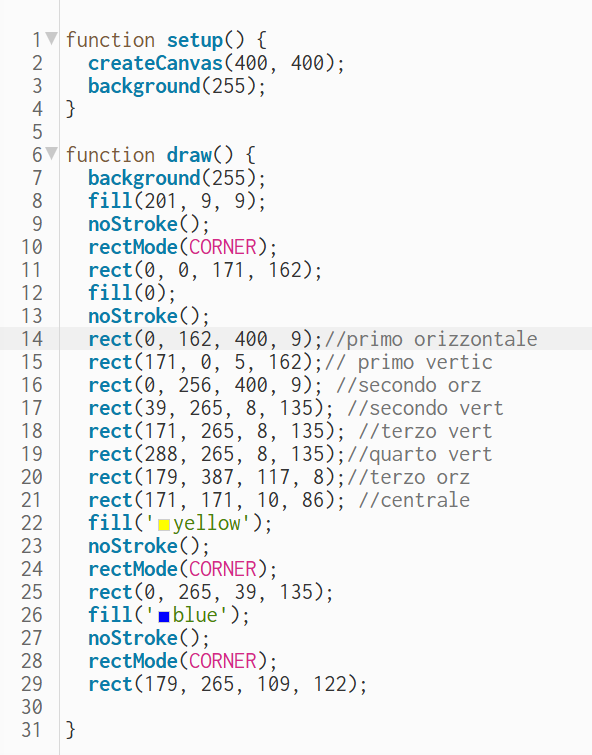 Da Figma ho ricavato le coordinate e le dimensioni di tutti i rettangoli neri che con il comando rectMode(CORNER) e rect ho ricreato, per poi fare i quadrati colorati sfruttando la posizione dei rettangoli neri in precedenza disegnati.