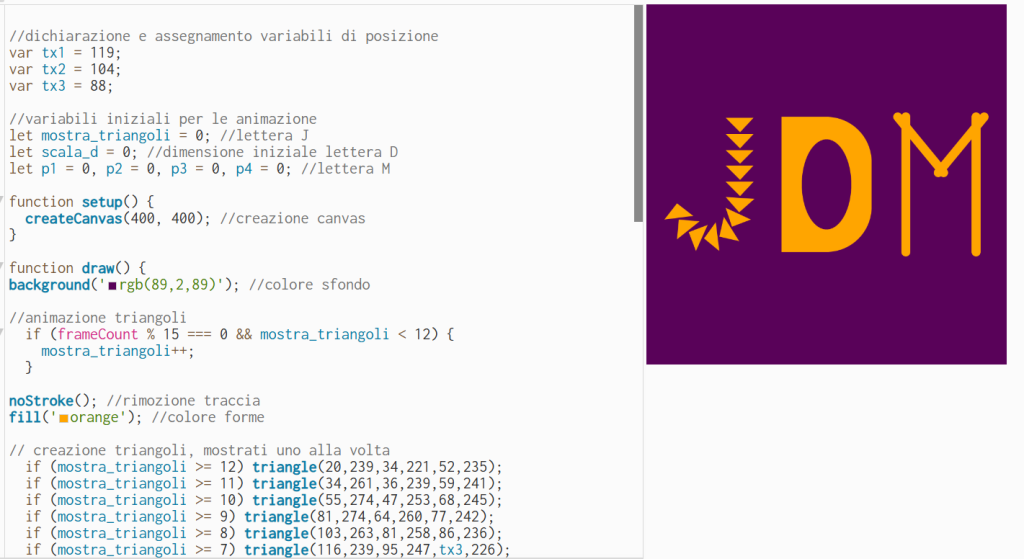 - la D compare come dal nulla nel centro della canvas ingrandendosi sempre più, fino a raggiungere una dimensione massima, pari a quella delle altre lettere